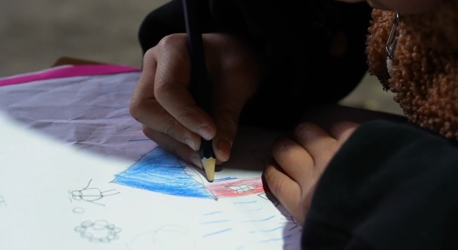 5岁的石俊峰攥着一个画着孙悟空的书套静静地看。石俊峰特别喜欢画画。他从小没见过妈妈,爸爸在外面打工,孤单的时候他就画画,开心的时候他画太阳,不开心的时候他画蓝色的雨。