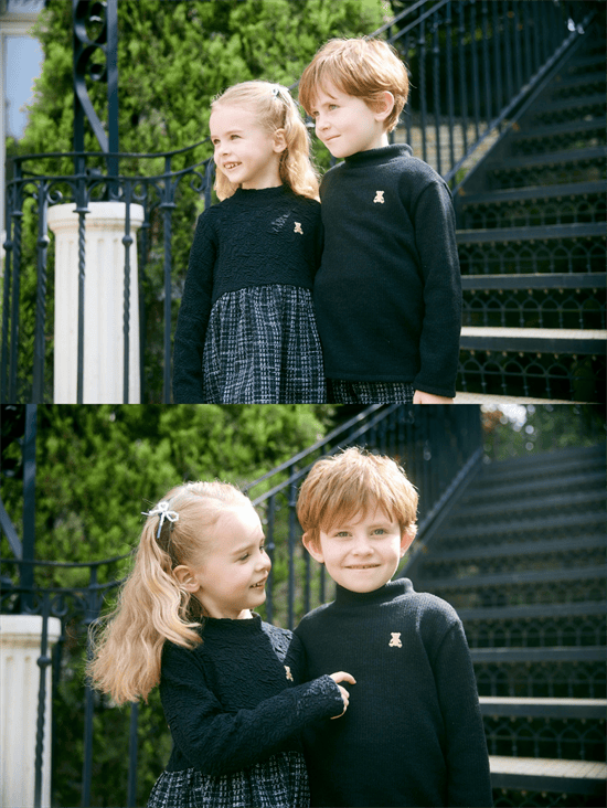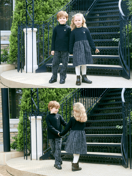 剪影熊系列连衣裙采用立体粗花呢面料,质感柔韧厚实,细腻的立领剪裁超显气质。搭配纯白内搭与精致皮鞋,轻松诠释出“千金风”穿搭的高贵与从容。男童的部分则以高领薄款罗纹针织上衣搭配粗花呢宽腿裤,剪裁利落、廓形挺拔。不仅保暖,还能凹出“小小绅士范儿”, 让宝贝在行走间都散发出自信与气场。