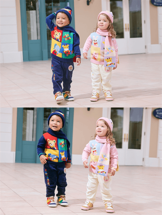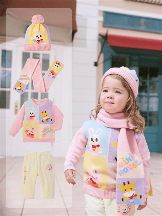 这个系列的毛衣采用更精致的嵌花编织工艺来呈现设计。嵌花编织工艺不同于传统的编织工艺,它针织出来的图案更细腻灵动的同时还能做到图案背面平整不扎身。当明亮色彩遇见可爱针织,宝贝拍照超级上镜,再搭配同系列围巾帽子,保暖又时髦。