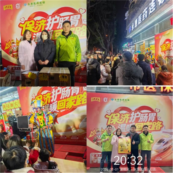 活动现场,健康守护板块成为核心亮点。王老吉药业带来保济口服液、保济丸等明星产品,精准贴合新春返乡途中饮食不规律、肠胃易不适的需求,为群众提供贴心的肠胃养护解决方案。专业团队全程在岗,耐心解答群众关于肠胃健康、日常养生的各类疑问,同时开展免费血压、血糖测量服务,全方位排查健康隐患,用专业力量为家人安康保驾护航,让返乡之路更安心。