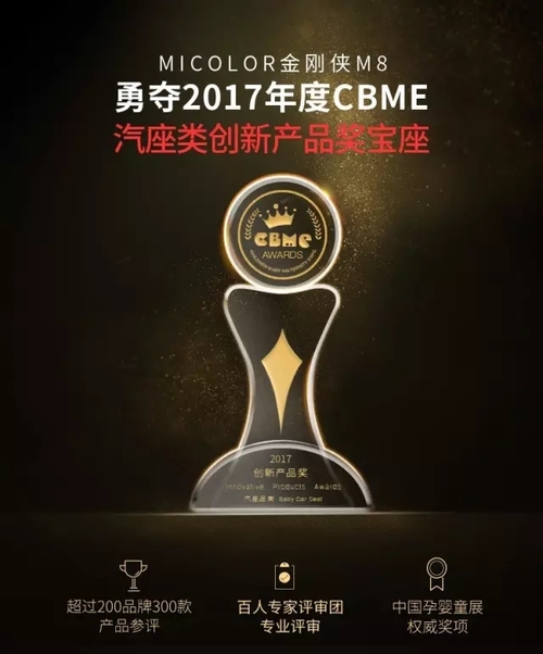 Micolor安全座椅金钢侠M8,在婴童用品行业一年一度的最权威展会CBME中国孕婴童展夺得创新产品奖。
