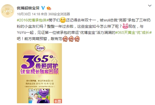10月30日,知名奶粉品牌优博就在官微上(@优博超级宝贝)连发了3张宝宝365天成长回顾图。记者了解到,这3个宝宝是去年双11优博“承包”奶粉活动的幸运中奖者。去年这个时候,他们中有的才刚满1个月、有的在蹒跚学步,有的甚至还没有出生。成长回顾图向粉丝们展现了在优博惊喜成长之礼的陪伴下,三位幸运宝宝的一年来对的成长变化。
