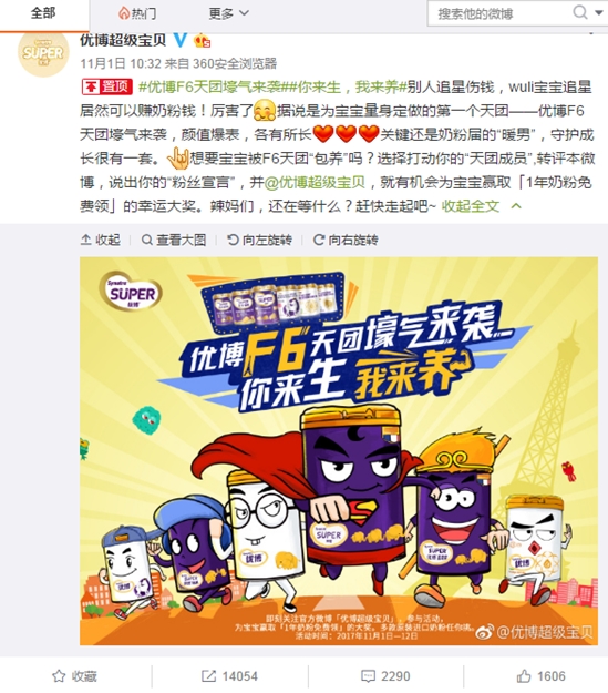 优博一直以来都以关爱母婴健康、专注奶粉产品研发与升级为己任,这几年来,更加关注年轻消费者的心理需求,洞察他们的生活习惯、兴趣偏好、消费理念等,据优博方介绍,此次“F6”天团“你来生,我来养”活动,F代表Friends,把六款奶粉比喻成陪伴宝宝快乐成长的六位好朋友,这也与优博的slogan“友爱成长,妙不可言”达成默契。优博双11不玩“套路”,玩“包养”的走心营销,成功俘获了万千宝妈的芳心,为国内其它的奶粉品牌树立了良好榜样。