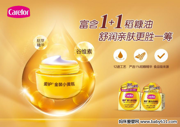 在秋冬季节,最重要的婴幼儿皮肤护理工作就是保湿。保湿不仅仅局限在补水,还要修护、滋养皮肤,增强皮肤抵抗力。爱护全新上市的金装小黄瓶,采用日本进口稻糠油,12道压榨工艺,保留稻糠油中谷维素和胚芽精华两种黄金成分,在干冷的秋冬季节,帮助抵御宝宝潜在的皮肤问题,成为秋冬季宝宝皮肤护理的一大法宝。爱护品牌也会一直秉承着守护宝宝健康未来的理念,深入研究宝宝皮肤特点,不断研发出更加适合婴幼儿的金牌护肤产品。