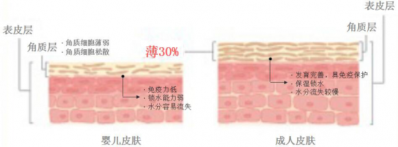 秋冬季干冷的天气会导致人体血管收缩,体内及皮肤水分缺失。同时,干冷的气候环境也会致使皮肤出油量减少,导致皮肤不能生成足够的油脂来维持皮肤的供水量。与成人皮肤不同,婴幼儿皮肤角质细胞较小,角质细胞内的缝隙较大,所以婴幼儿皮肤相对敏感,非常容易受到外界环境的影响。尤其是遇到干冷的天气,宝宝皮肤的水分很容易流失,导致皮肤干红不适。因此,秋冬季宝宝的皮肤就会出现缺水、干燥甚至皴裂等症状,麻麻们需要格外留心了。