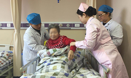 纪翠华主任(左一)给患者陈奶奶检查恢复情况
