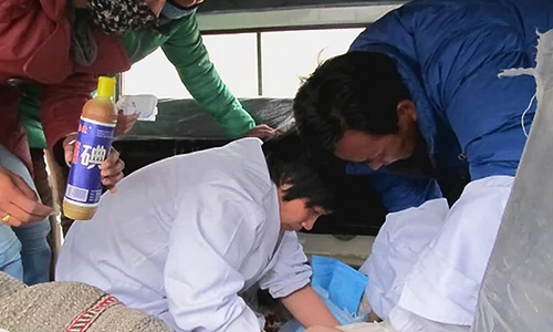 在海拔4700米的山路上,纪翠华主任跪在急救车上给高危产妇接生